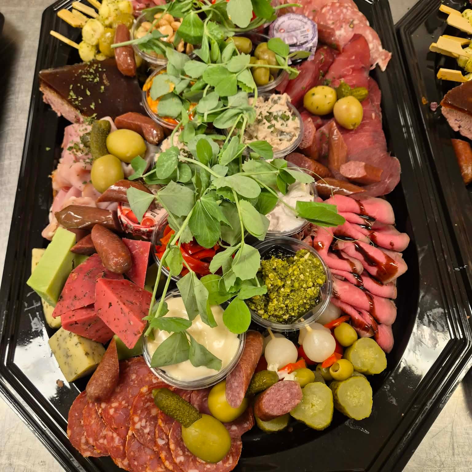 Kommer anrettet på flotte sorte melamin fade, lige til at sætte på bordet.